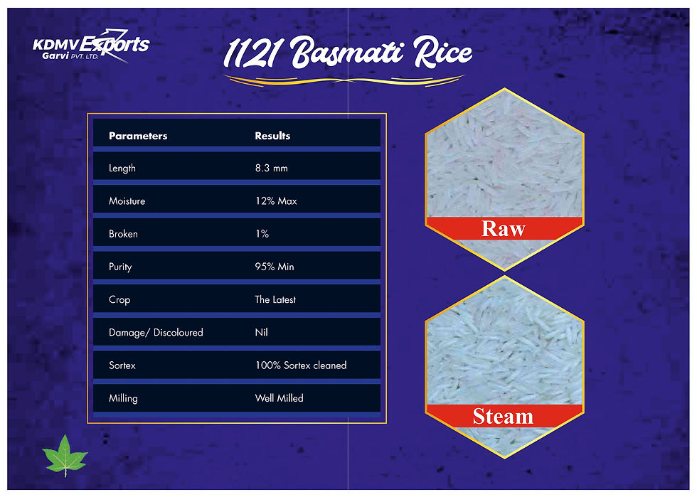 KDMV Garvi Exports Pvt.Ltd., a leading supplier of premium quality rice. We specialize in exporting and distributing rice that meets the highest standards of quality, consistency, and taste. Our rice varieties are sourced from trusted farms and processed using state-of-the-art technology to ensure that every grain is perfect for your market.